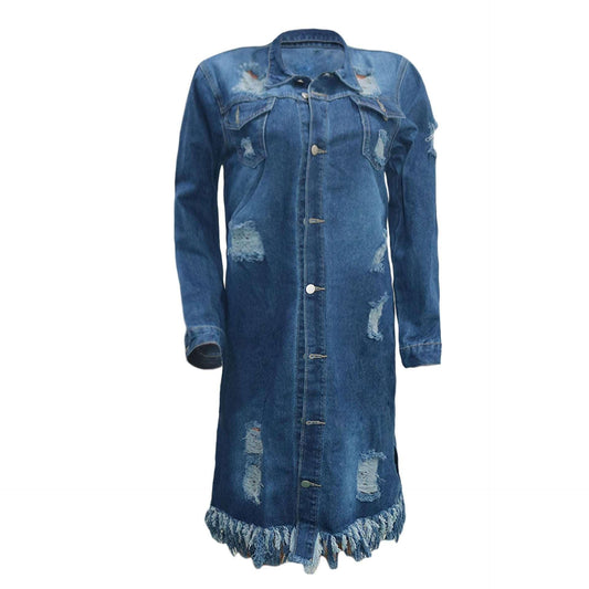 Dark Blue Fashion Casual Adult Solid Ripped Turndown Collar Long Sleeve Straight Denim