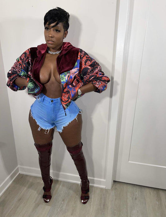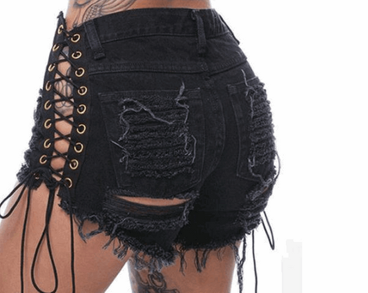Mouth Biting Finger Print Fashion Ripped Denim Shorts