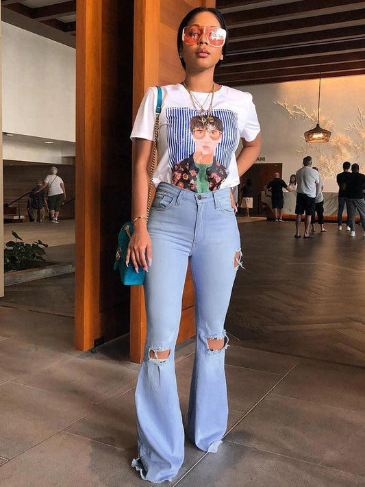 Cool Fashion Personality, Worn-Out Holes, White High-Waisted Jeans, Thin, Fringed Fringe Weird Denim Jeans For Ladies
