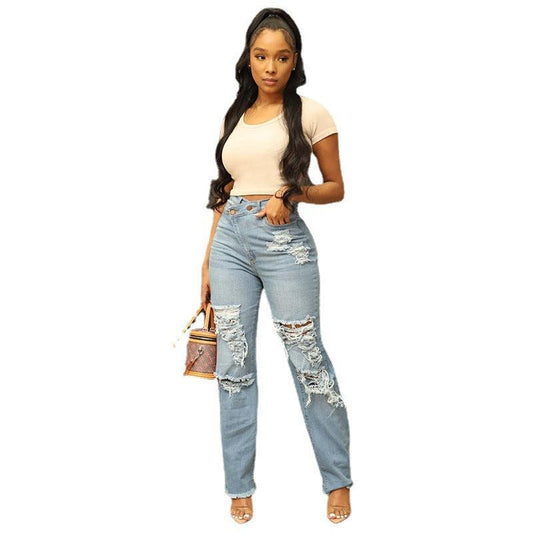 Solid Color Trendy Fashion Ripped Slim Jeans Trousers